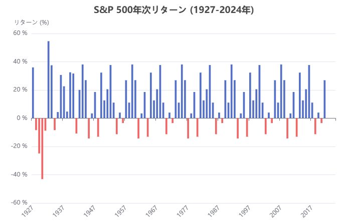 実際、S&P500指数の過去の年次リターンを見ると、長期的には毎年平均でプラスの上昇が続いています。以下のグラフは、1927年以降の年間リターンを示しており、ボラティリティが高い中でも緩やかな上昇トレンドが見て取れます。