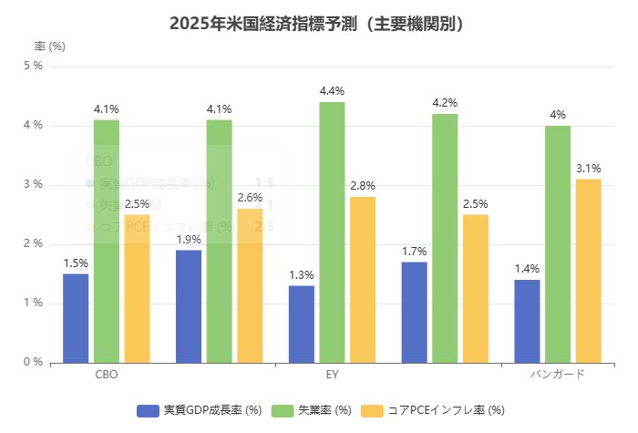 1. 2025年の米国経済指標と株式市場: 2025年は米国経済が緩やかな成長局面にあると予想されています。米連邦議会予算局(CBO)の見通しでは、2025年の米国実質GDP成長率は約1.5%程度となり、インフレ率も徐々に目標の2%近くまで低下する見込みです。またFRB(連邦準備制度)も2025年のGDP成長率を約1~2%前後と予測しており、失業率も概ね3~4%台半ばと安定する見通しです。このように景気後退ではなく緩やかな成長(いわゆる「ソフトランディング」)が達成されるとの期待が高まっています。実際、2025年には景気後退は避けられるとの予測が多数派であり、景気減速局面からの持続的な回復が見込まれています。以下のグラフは、主要機関による2025年の米国経済指標の予測を示しており、緩やかな成長とインフレの沈静化が見込まれていることがわかります。