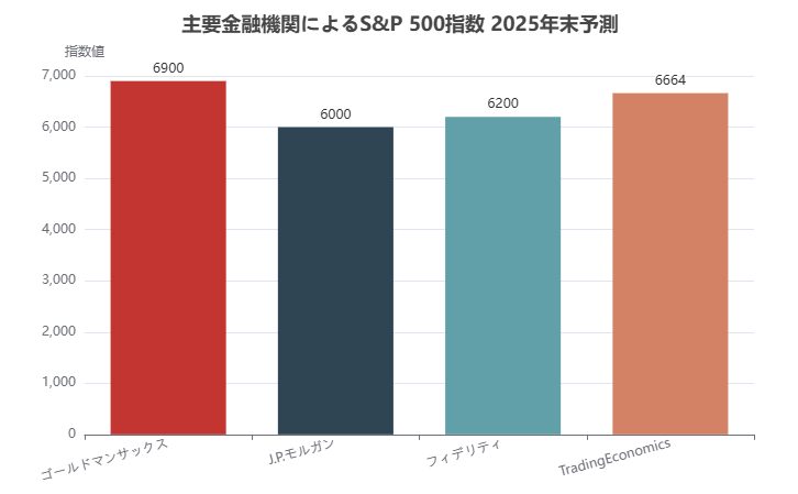 2. 金利動向と金融政策: 2025年の株式市場にとって最も影響力のある要因の一つが金利動向です。2022~2023年にかけてFRBはインフレ抑制のために急激な金利引き上げを行い、政策金利(フェデラルファンドレート)は5%台前半まで引き上げられました。しかし2025年に入りインフレ率は低下傾向にあり、FRBは金融引き締めを終え2025年後半から金融緩和(金利引き下げ)に転じる見通しです。実際、2025年9月のFRBの会合では政策金利を0.25%引き下げ、これは2022年以降初の利下げとなりました。またFRBの発表する「ドットプロット」(金利予測)によれば、2025年中にさらに2回程度の追加利下げが見込まれ、年末時点で政策金利は約3.5~3.75%程度まで低下するとされています。長期金利である10年物米国債利回りも、2024年に一時4%台後半まで上昇しましたが、2025年にはインフレ沈静化と利下げ期待から徐々に低下すると予想されています。金利低下局面は株式市場にとって追い風です。金利が下がると企業の借入コストが下がり利益改善につながるだけでなく、債券など他資産に比べ株式の魅力が相対的に高まります。特に成長株や高評価株は将来のキャッシュフローを現在価値に割り引く際に金利の影響を強く受けるため、金利低下はそうした銘柄の株価上昇を後押しします。実際、2025年に入りFRBの利下げ観測が強まるにつれ、米株は上昇基調に転じており、S&P500指数は2025年7月時点で年初来+7%の上昇となっています。市場参加者の間でも「金利低下局面では年末まで株式市場は上昇基調が続く」との見方が多く、主要証券会社の予測でも2025年末時点のS&P500指数は現在よりさらに上昇するとの楽観的な見通しが示されています。例えばゴールドマンサックスは「FRBの利下げが予想より早く深くなる」ことを背景に、S&P500指数の半年後予測値を6,600(前回予測6,100)に上方修正しています。さらに12か月後の予測では6,900(前回6,500)とさらなる上昇を見込んでいます。主要金融機関によるS&P500指数の年末予測は以下の通りです。