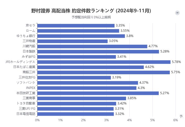 2025年現在、投資家から人気の高い日本株高配当銘柄をいくつか紹介します。以下のグラフは、2024年後半に野村證券の個人投資家によって買われた高配当株の人気ランキングを示しており、これらの銘柄は安定収益や増配実績から注目されています。