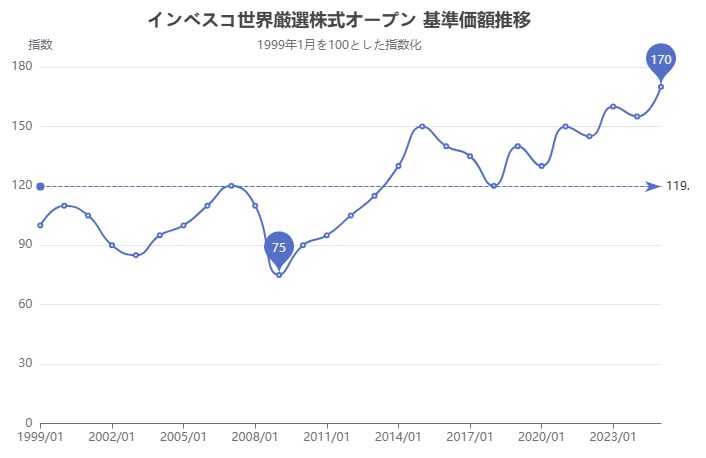 - インベスコ 世界厳選株式オープン(世界のベスト): 以下のグラフは、世界のベストの基準価額(分配金再投資ベース)の長期的な推移を示しています。1999年の設定時を100とすると、2000年代前半までは緩やかな上昇基調でしたが、2008年のリーマンショックで大きく下落しました。その後、2010年代に入り世界株式市場の回復に伴い基準価額も上昇し、2015年8月に設定以来の高値(約18,613円)を付けました。その後はやや調整局面もありましたが、2020年のコロナショック後は世界的な金融緩和で株式市場が急騰し、基準価額も上昇傾向をたどりました。2023年頃までには1万円台前半まで回復し、2025年現在もその水準を維持しています。なお、分配金を受取型にしている場合、基準価額は分配ごとに下落しますが、再投資ベースでは長期的な上昇トレンドが見て取れます。今後の予測としては、世界経済の成長や企業収益の拡大に伴いゆるやかな上昇基調が続くとの見方が一般的です。ただし、米国の金融政策転換や地政学リスクなど不確実性もあり、短期的な変動は避けられません。世界のベストはグローバル分散投資を行っているため、特定国の景気変動に左右されにくい利点がありますが、同時に世界株式全体の動向に連動するため、市場全体の下落局面では基準価額も下がるリスクがあります。