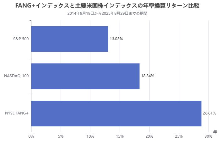 過去のパフォーマンスを見ても、FANG+は驚異的なリターンを叩き出してきました。以下のグラフは、そのポテンシャルの高さを物語っています。