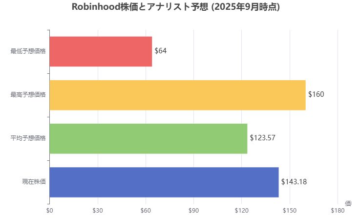 以下のグラフは、2025年9月末時点でのRobinhood株価と、複数のアナリストによる12か月先の予想目標価格を示しています。