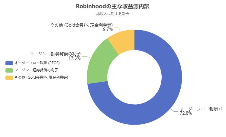 以上のように、Robinhoodのビジネスモデルは「手数料ゼロ」で顧客を惹きつけ、そのユーザー行動から派生する収益(PFOFや利子など)で利益を上げるというものです。以下のグラフは、Robinhoodの収益源の内訳を視覚的に示しています。