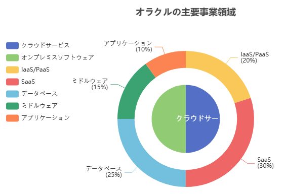 オラクルの事業領域は大きく分けてクラウドサービスとオンプレミス向けソフトウェアの2つに分類できます。以下の図は、その主要な事業領域を視覚的に示したものです。