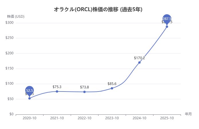 オラクルの株式(NYSE: ORCL)は近年強い上昇傾向を示しており、テック株全体の好調も相まって株価水準は過去最高値圏に達しています。過去5年間の株価推移を見ると、2020年にコロナ禍で一時下落したものの、その後のクラウド事業の成長期待から株価は着実に回復・上昇しています。特に2023年以降、生成AIブームやクラウド需要増加を受けて上昇ペースが速まり、2025年には株価が大幅に上昇しています。例えば2025年10月時点での株価は約280~290ドル台となっており、1年前(2024年10月)の約170ドル前後から約70%もの上昇となっています。これは同社の業績好調や市場評価の向上が反映された結果です。