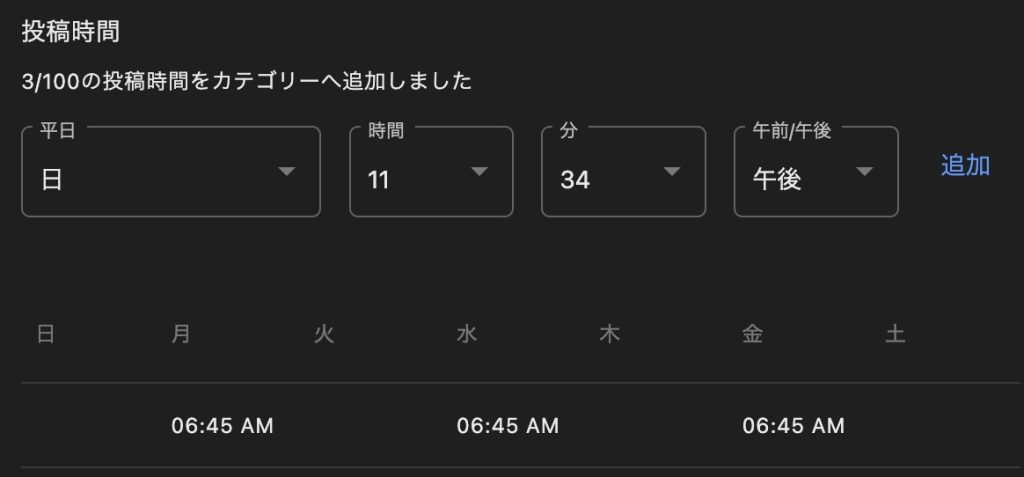 例えば、以下のように設定すると、月・水・金の朝6:45に同じ投稿を行えるように設定できるパターンです。パターン化することができ、うまく使えれば効率化できます。