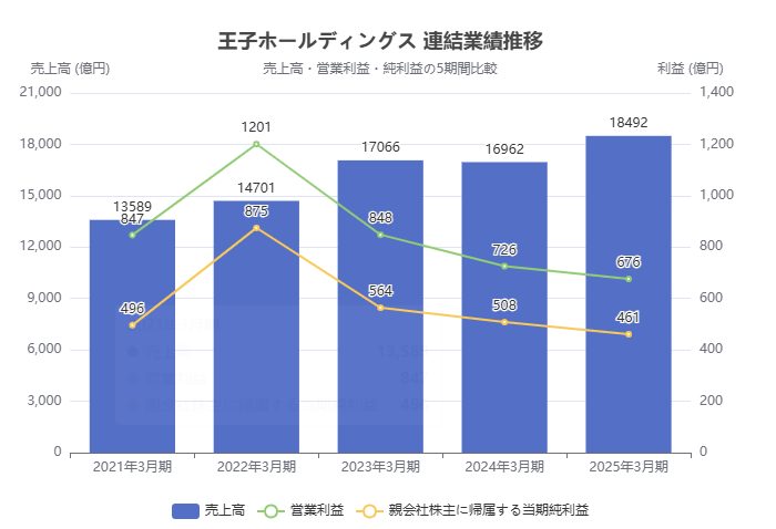 王子HDの近年の財務成績を見ると、売上高は概ね増加傾向にありますが、営業利益や純利益は原燃料価格の変動など外部環境の影響を受けて推移しています。直近5期の連結業績を表にまとめます。