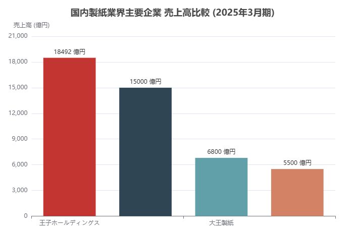 日本の製紙業界では、王子HDに次いで日本製紙(3863)、大王製紙(3880)、レンゴー(3941)などが主要な競合企業として挙げられます。王子HDは売上高規模で国内トップクラスであり、世界的にも上位5位に入る巨大企業です。これに対し、日本製紙は王子HDに次ぐ国内第2位の製紙メーカーで、新聞用紙や印刷用紙、家庭紙など幅広い事業を展開しています。大王製紙は国内第3位の製紙メーカーで、紙おむつや家庭紙など生活資材分野が強みです。レンゴーは段ボール加工や包装資材を主力事業とする企業で、パッケージング分野で国内有数のシェアを持ちます。以下のグラフは、これら主要競合企業の売上高を比較したものです。