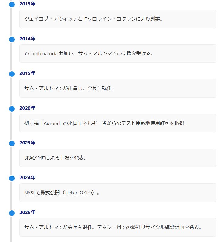 Oklo Inc.(オクロ)は、カリフォルニア州サンタクララに本社を置く先進原子力技術企業です。2013年7月にマサチューセッツ工科大学(MIT)出身のジェイコブ・デウィッテ(Jacob DeWitte)とキャロライン・コクラン(Caroline Cochran)によって創業されました。創業者のデウィッテ氏は現在もCEOを務め、創業以来ボードメンバーでもあります。コクラン氏も共同創業者であり、創業当初はCTOを務めましたが、2018年に退任しています。創業後まもなく2014年、スタートアップインキュベーターのY Combinatorに参加し、OpenAIのCEOで当時Y Combinatorのプレジデントだったサム・アルトマン(Sam Altman)の支援を受けました。アルトマン氏は2015年にOkloに出資し、以降2025年4月まで会長を務めてきました。その後、2023年7月にはアルトマン氏が共同設立した特殊目的取得会社(SPAC)「AltC Acquisition Corp.」との合併により上場を発表し、2024年5月にNYSE(ニューヨーク証券取引所)で株式公開(Ticker: OKLO)を果たしました。このSPAC合併により約6億ドルの資金調達を行い、事業拡大に活用しています。以下のタイムラインに、Okloの主な歴史的マイルストーンをまとめます。2013年ジェイコブ・デウィッテとキャロライン・コクランにより創業。2014年Y Combinatorに参加し、サム・アルトマンの支援を受ける。2015年サム・アルトマンが出資し、会長に就任。2020年初号機「Aurora」の米国エネルギー省からのテスト用敷地使用許可を取得。2023年SPAC合併による上場を発表。2024年NYSEで株式公開(Ticker: OKLO)。2025年サム・アルトマンが会長を退任。テネシー州での燃料リサイクル施設計画を発表。