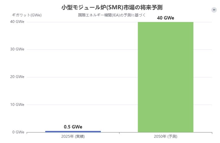 Okloが属する小型モジュール炉(SMR)市場は、近年世界的に注目を集めている成長産業です。気候変動対策の観点から脱炭素エネルギーへの転換が叫ばれる中、再生可能エネルギーの出力変動を補いベースロード電力を供給できる原子力エネルギーが再評価されています。特にSMRは従来型の大型原子炉に比べ建設コストが低く、工期が短く、設置場所の制約も少ないことから、新興国や離島・遠隔地、産業団地向け電源として期待されています。国際エネルギー機関(IEA)の試算では、SMRの導入が進めば2050年までに世界で約40GWeのSMR容量が稼働する可能性があり、大規模原子炉に次ぐ主要な電源となると予測されています。以下の図は、この予測を視覚的に示したものです。
