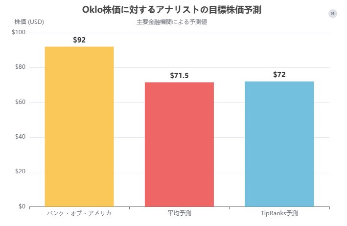 また、分析家の見方としては意見が分かれています。悲観論者は「まだ収益ゼロで将来の不確実性が大きい」として慎重な姿勢を示し、信頼度の高い評価指標が乏しい点を指摘しています。一方で楽観論者は「原子力リナッサンスの象徴的存在」と位置付け、Okloが将来「エネルギー界のテスラ」のような存在になり得ると評価する声もあります。実際、一部の金融機関(例:バンク・オブ・アメリカ)はOklo株に「買い」評価を付与し、1株あたり92ドルという高い目標株価を提示しています。以下の図は、主要な金融機関による目標株価の予測を示しています。