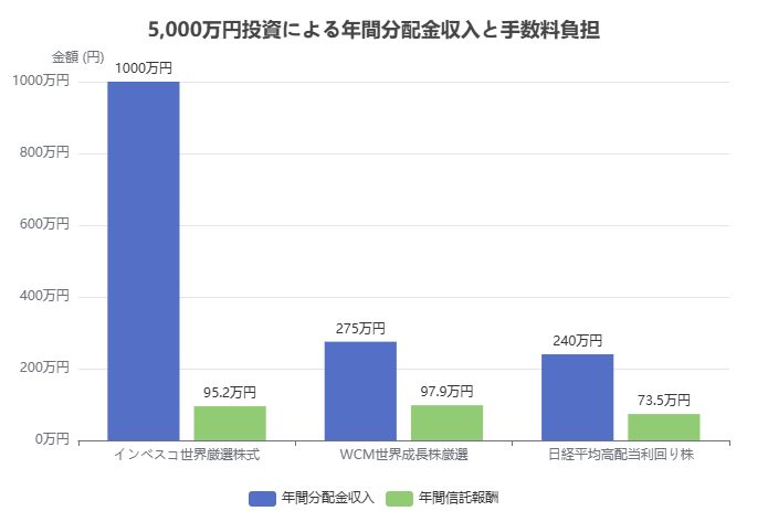 以下のグラフは、5,000万円を各ファンドに投資した場合の、年間の分配金収入と手数料負担を比較したものです。