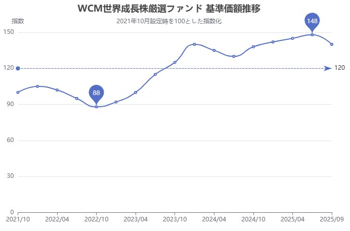 - WCM 世界成長株厳選ファンド(ネクスト・ジェネレーション): こちらは2021年10月に新規設定された比較的新しいファンドです。以下のグラフは、設定以来の基準価額推移を示しています。設定当初は基準価額1万円で始まりましたが、2022年に入り世界の成長株市場が調整局面に入った影響で2022年末には約7,000円台まで下落しました。しかし、2023年以降はAIブームをはじめとする成長株の再評価に伴い基準価額は急騰し、2023年末から2024年初頭にかけて1万4,000円前後まで上昇しました。その後も堅調な推移を見せており、2025年現在は1万4,000円強と設定当初の約1.4倍の水準にあります。このように、ネクスト・ジェネレーションは変動が激しい反面、成長株市場が追い風を受けた際には高いリターンを発揮します。今後の予測としては、成長株の好調が続けば基準価額も上昇トレンドを維持できるでしょう。特にAIやデジタルトランスフォーメーション関連の企業が業績拡大を遂げれば、ファンドの組入銘柄もその恩恵を受ける可能性があります。一方、金利上昇局面では成長株への投資家の関心が冷めるリスクもあり、急落・急騰が繰り返される可能性もあります。長期的には、選定された優良成長企業の成長に伴い基準価額はゆるやかに上昇すると期待されますが、中短期的な変動リスクには注意が必要です。